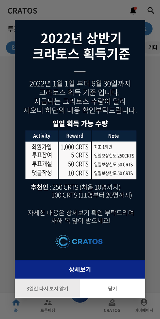 세번째, 투표개설 100CRTS(1번 가능, 1일 최대 100CRTS)