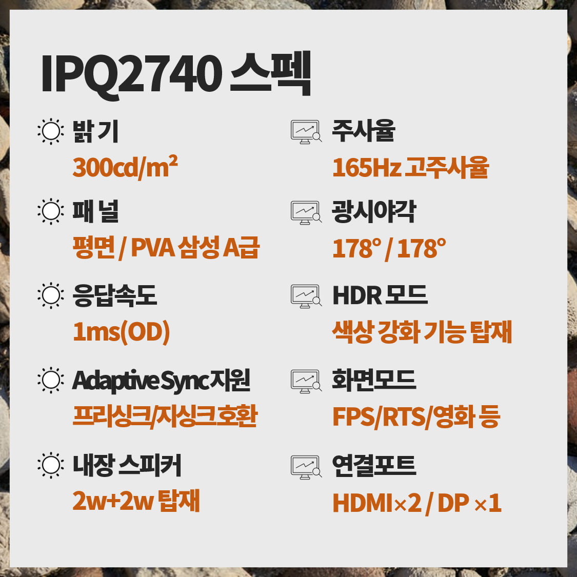 스펙은 27인치(65.5cm) 사이즈에 QHD(2560*1440)의 고해상도 모니터입니다. 삼성 정품 A급 패널을 사용했고, 밝기는 300cd/m²입니다. 확실히 이전에 쓰던 FHD 제품과 바로 옆에서 비교했을때, 선명함과 부드러움이 틀립니다.