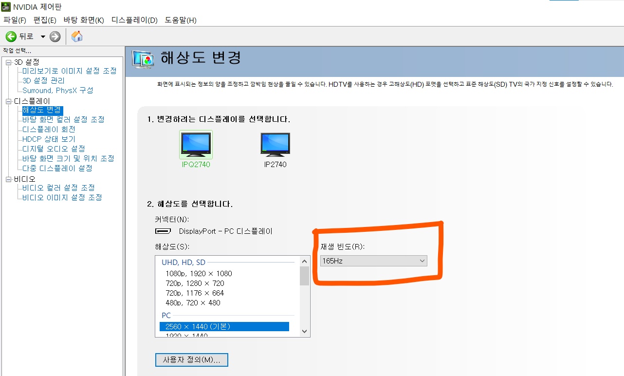 엔비디아 제어판 들어가셔서 165hz 설정해주셔야 합니다. 아니면 65hz 자동설정 됩니다.